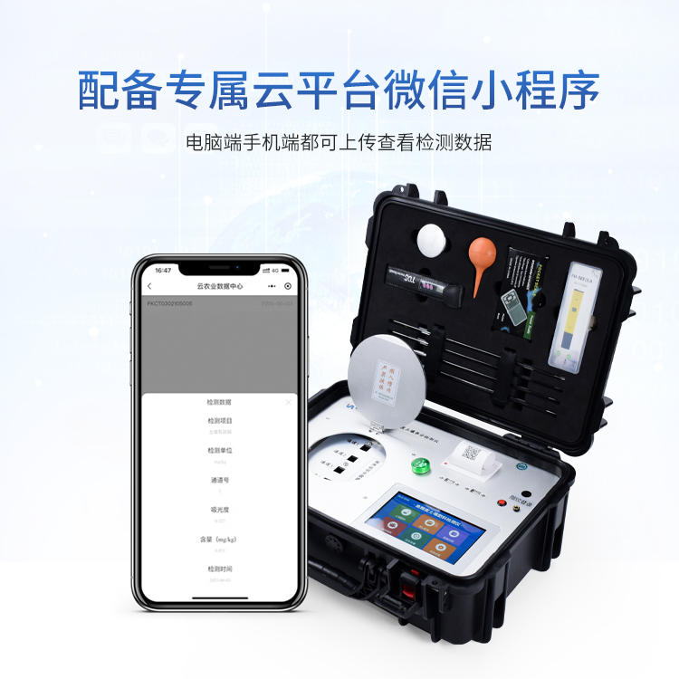 8.数据打印:内置热敏打印机(无需更换色带),可打印出检测项目、检测单位、检测人员、检测时间、通道号、吸光度、养分含量(mg/kg)、以及二维码等信息。